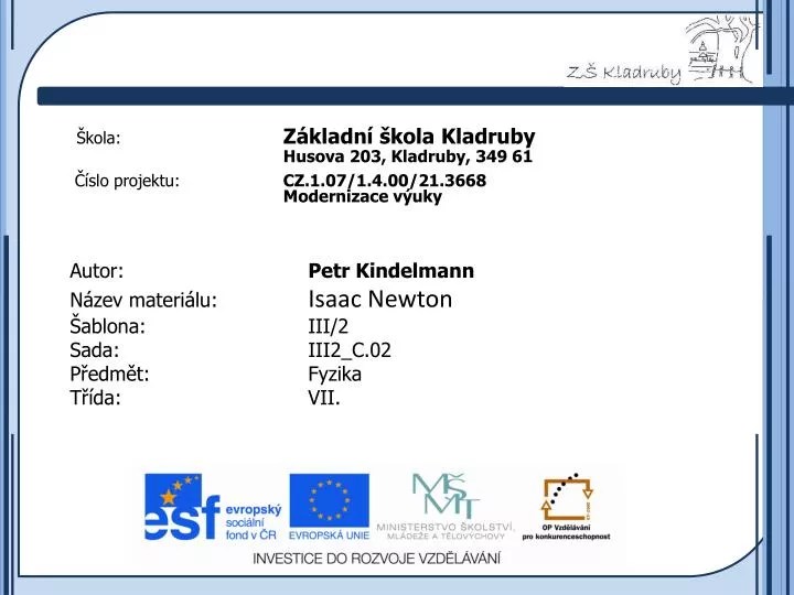 Tady je možné shlédnout prezentaci k tématu newtonovy zákony: Cz.1.07/1.4.00/21.3443 projekt je spolufinancován evropským sociálním fondem a státním rozpo čtem české republiky. Tady je možné shlédnout prezentaci k tématu newtonovy zákony: Dana kaprálová zpracováno v rámci projektu „krok za krokem na zš ž elatovská ve 21. Tady je možné shlédnout prezentaci k tématu newtonovy zákony: